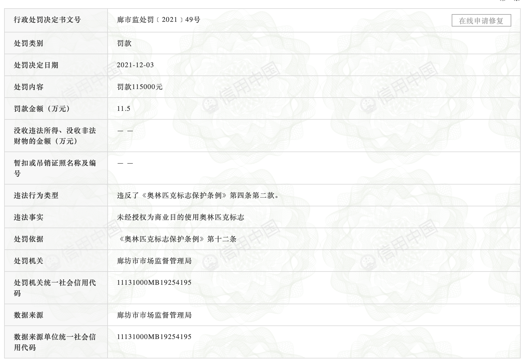 信用中国网站显示,12月3日,好丽友食品有限公司新增一则行政处罚信息,因其未经授权为商业目的使用奥林匹克标志被廊坊市市场监督管理局罚款11.5万。