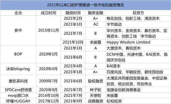 新品牌想要迅速打开口腔护理市场,漱口水和口腔喷雾成了目标,一时间许多快时尚品牌成立,15年小阔科技创立“参半”,19年格芒商贸创立“BOP”,冰泉化妆品科技创立“冰泉”等,且相继获得融资,各个品牌在今年至少都完成了一轮融资。