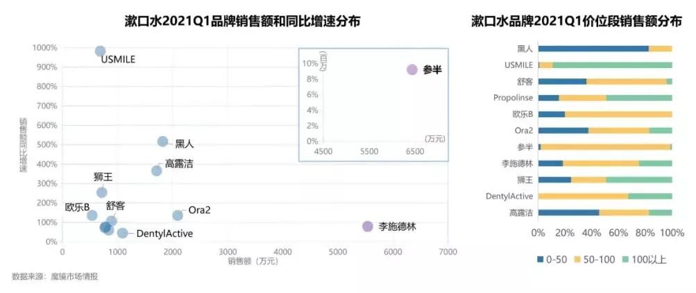 再者,漱口水品牌的复购率仅达50%,长期坚持使用漱口水的人群占比偏低,且在泡沫堆叠的快销时代,消费者很难对新晋品牌产生好感,相反牙膏行业巨头做漱口水很容易打开市场,虽然没有花样百出的包装和口感,但更容易被大众接受。