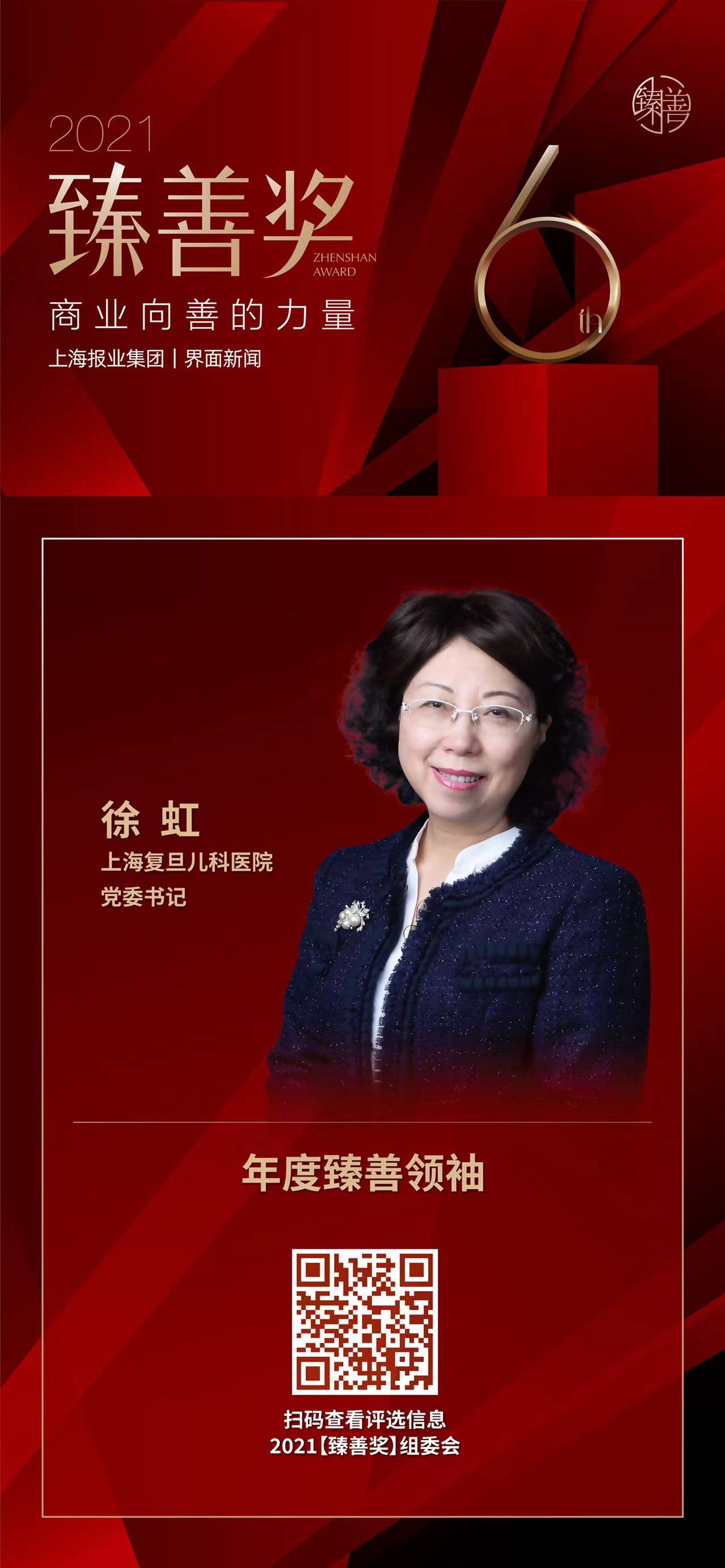12月16日,上海报业集团|界面新闻在上海前滩香格里拉酒店举办了2021【臻善奖】颁奖典礼,并正式公布了本年度获奖名单。围绕商业向善这一责任旨归,在公益慈善领域有所贡献的优秀企业和公益人士踊跃参加。上海复旦大学附属儿科医院党委书记徐虹女士凭借医者仁心,以及精益求精的慈善实践精神,荣膺年度臻善领袖称号。