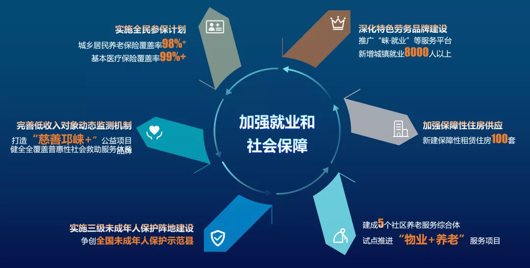 加强就业和社会保障。深化特色劳务品牌建设,推广“崃·就业”等服务平台,新增城镇就业8000人以上。深入实施全民参保计划,城乡居民养老保险、基本医疗保险覆盖率分别达98%以上和99%以上。加强保障性住房供应,新建保障性租赁住房100套。完善低收入对象动态监测机制,打造“慈善邛崃+”公益项目品牌,健全全覆盖普惠性社会救助服务体系。建成临邛街道、文君街道等5个社区养老服务综合体,试点推进“物业+养老”服务项目。实施三级未成年人保护阵地建设,争创全国未成年人保护示范县。