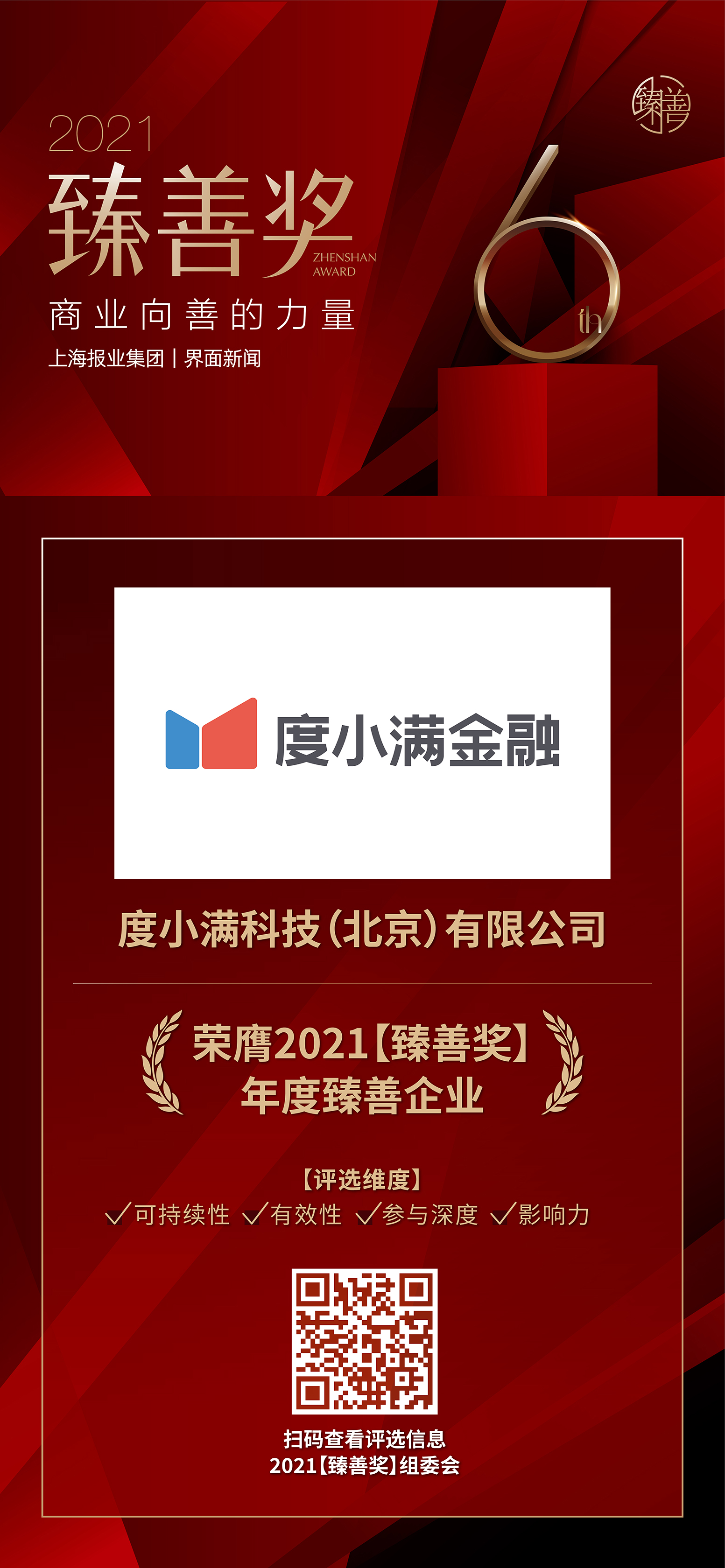 12月16日,上海报业集团|界面新闻在上海前滩香格里拉酒店举办了2021【臻善奖】颁奖典礼,并正式公布了本年度获奖名单。围绕商业向善这一责任旨归,在公益慈善领域有所贡献的优秀企业和公益人士踊跃参加。度小满科技(北京)有限公司以卓越的CSR及慈善实践精神,荣获年度臻善企业大奖。