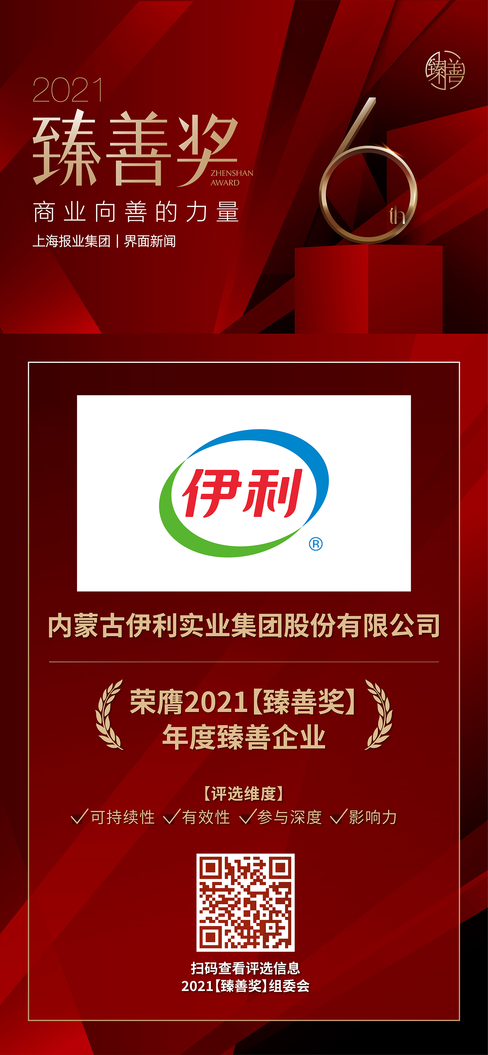 12月16日,上海报业集团|界面新闻在上海前滩香格里拉酒店举办了2021【臻善奖】颁奖典礼,并正式公布了本年度获奖名单。围绕商业向善这一责任旨归,在公益慈善领域有所贡献的优秀企业和公益人士踊跃参加。内蒙古伊利实业集团股份有限公司以卓越的CSR及慈善实践精神,荣获年度臻善企业大奖。