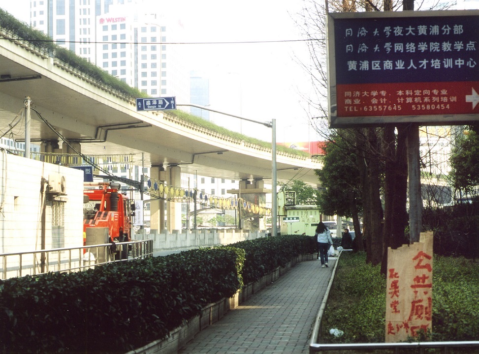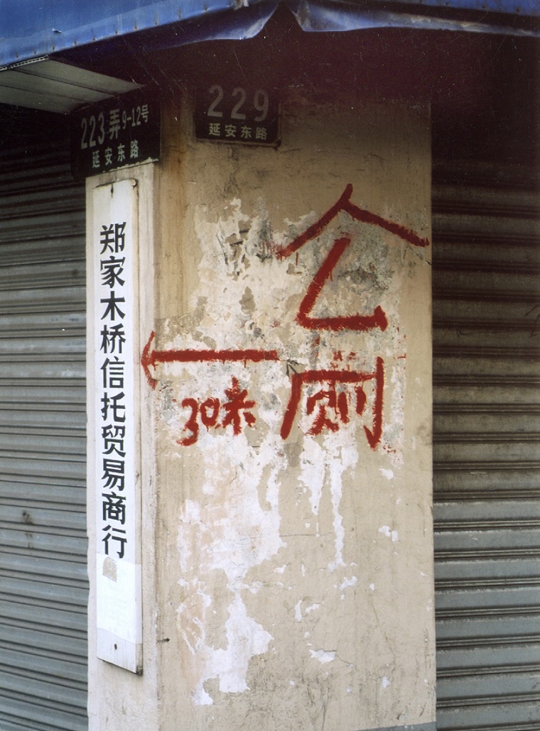 2002年12月底,我回上海探亲和观摩《晋唐宋元书画展》。一天,坐汽车到福州路一带笔墨庄买笔墨,在浙江路站下车后,由延安东路向河南路走去,在延安东路立交桥下的路旁,我见到一块三合板,上面写着﹕“公共厕所,在弄堂,走30米”。