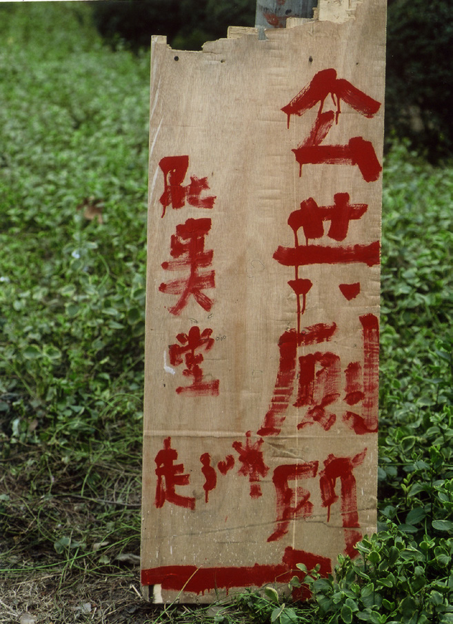 上海在80年代建了很多收费的公共厕所,一般的公共厕所在附近马路旁都有醒目的标志和指示牌,以方便居民和旅客。我所注意的那处厕所大概是新建,指示牌还没装好,管理者不愿因此影响服务和收入,临时写了块牌子告示行人。牌子上的字是用扁刷子写的,写得比较随意,油漆蘸多了,还有往下滴的痕迹。