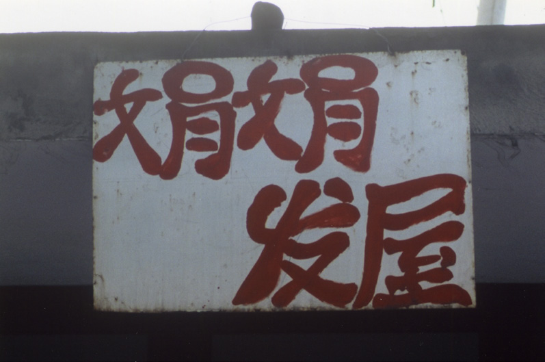 招牌看来是写在白色的油漆漆过的三合板上(由于当时要赶路,没有仔细核实)。从字迹上来判断,这一招牌并非出自训练有素的书手。不过,和上面提到的“禁止入内”和“公共厕所”的牌子相比,“娟娟发屋”的书写多少带有一些审美创作的意识,因为它明显地受到了美术字的影响,应该就是模仿和毛笔书法比较接近的美术字来书写的。
