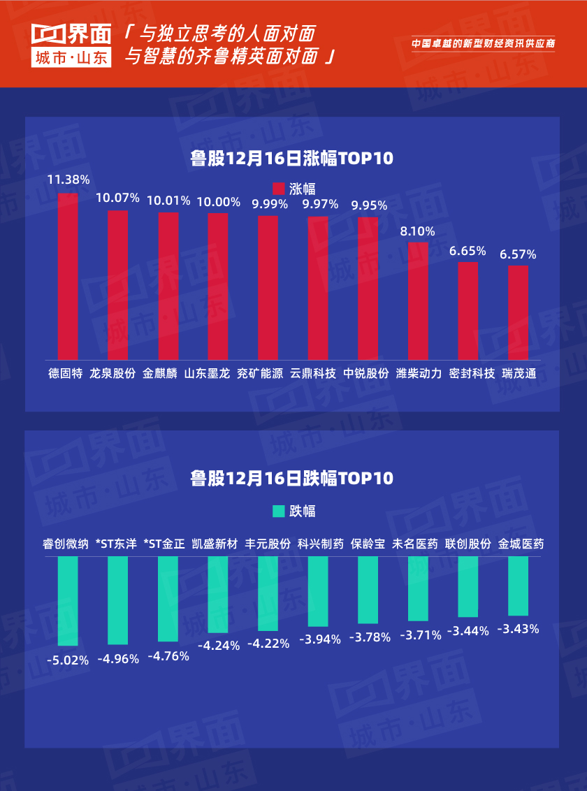 受大盘影响,12月16日,山东省内沪深股票有170只个股上涨,80只下跌,德固特领涨。