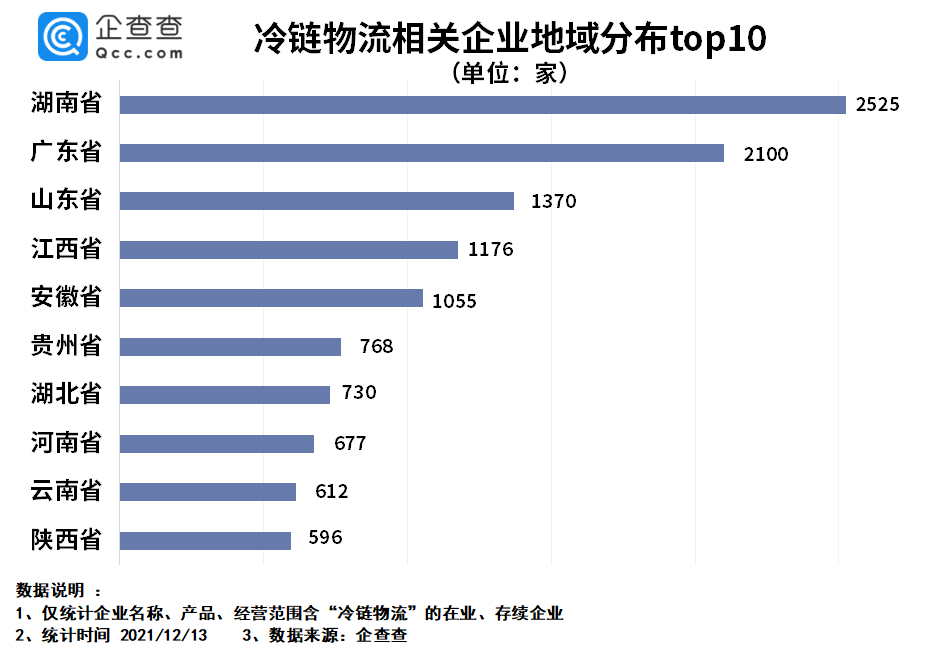 据中物联冷链委发布《2020年中国冷链物流百家重点企业分析报告》显示,2020年我国冷链物流市场规模已超过3800亿元。企查查数据显示,截至今年12月,我国现存冷链物流相关企业1.9万家,湖南省以2525家企业排全国第一。广东、山东分列二三位,企业量分别为2100家、1370家。