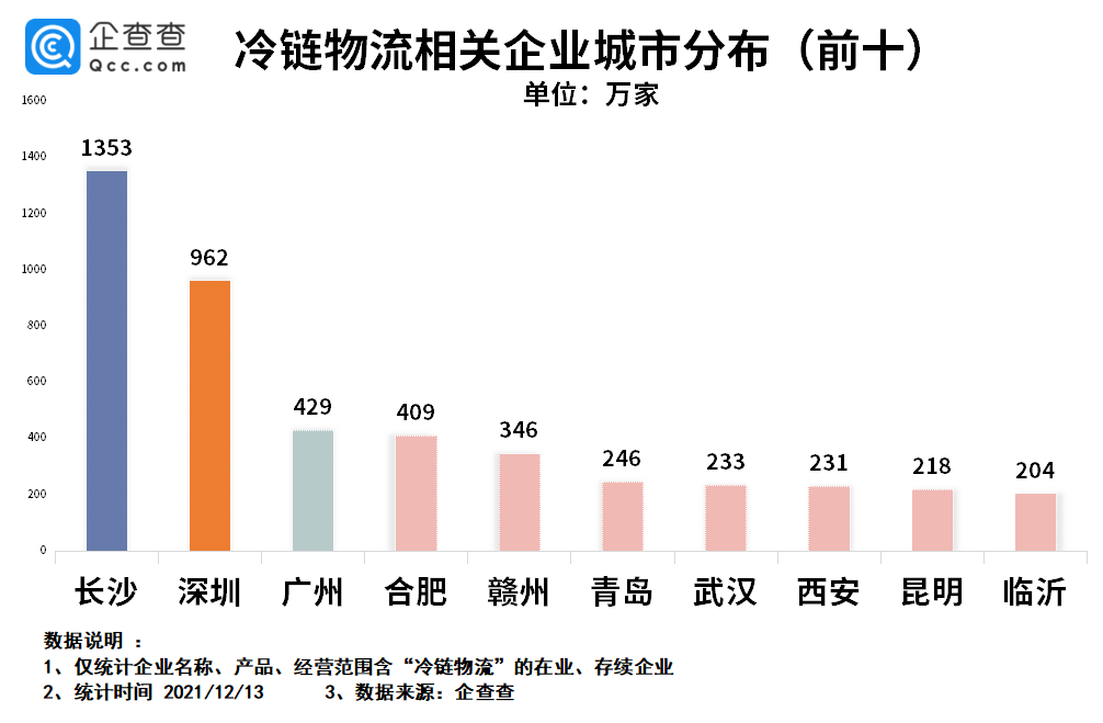 从城市分布来看,企查查数据显示,冷链物流相关企业数量排名前三的城市是长沙、深圳、广州,分别有企业1353家、962家、429家。其次是合肥、赣州、青岛等城市。
