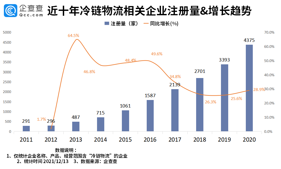 从近十年冷链物流相关企业发展状况来看,企查查数据显示,2019年和2020年是企业注册的高峰期,年注册量分别为3393家、4375家,其中2019年注册量同比增长25.6%,2020年注册量同比增长28.9%。2021年前11月共新注册2475家,同比下跌了38.2%。