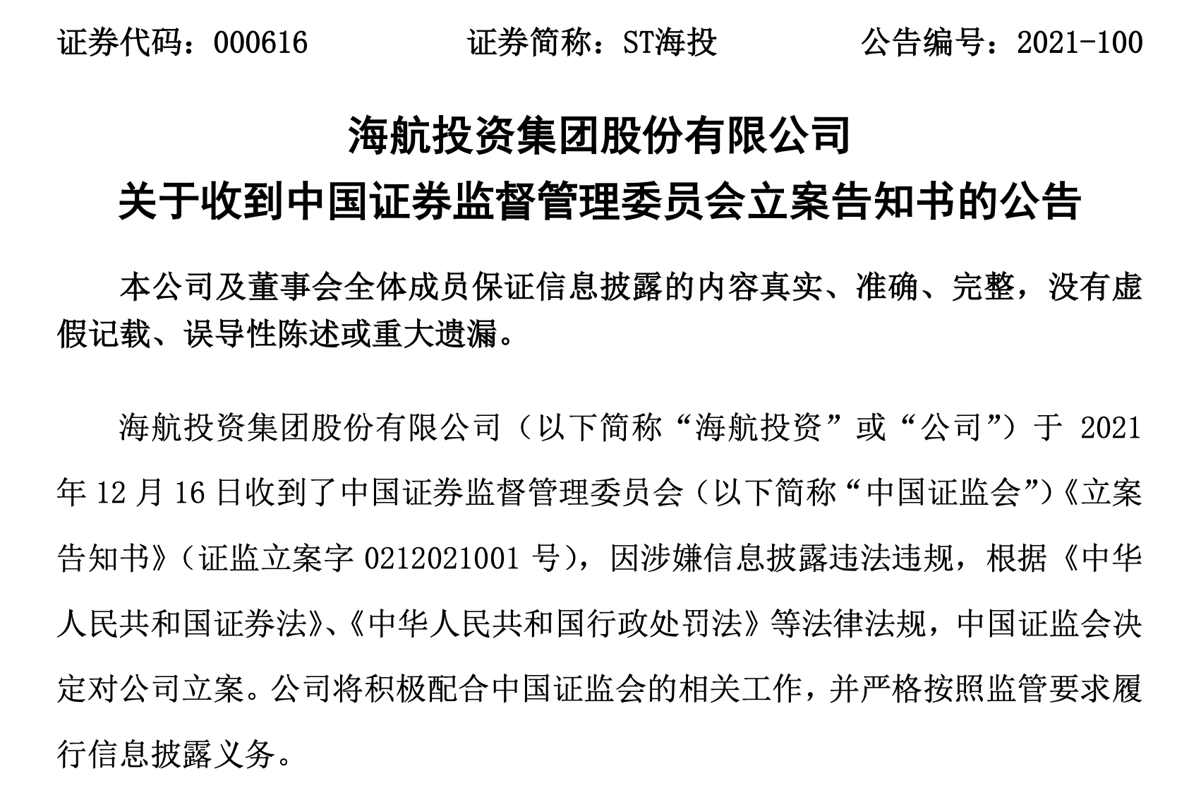 12月17日消息,ST海投昨日晚间公告称,收到中国证监会《立案告知书》,因涉嫌信息披露违法违规,中国证监会决定对公司立案。