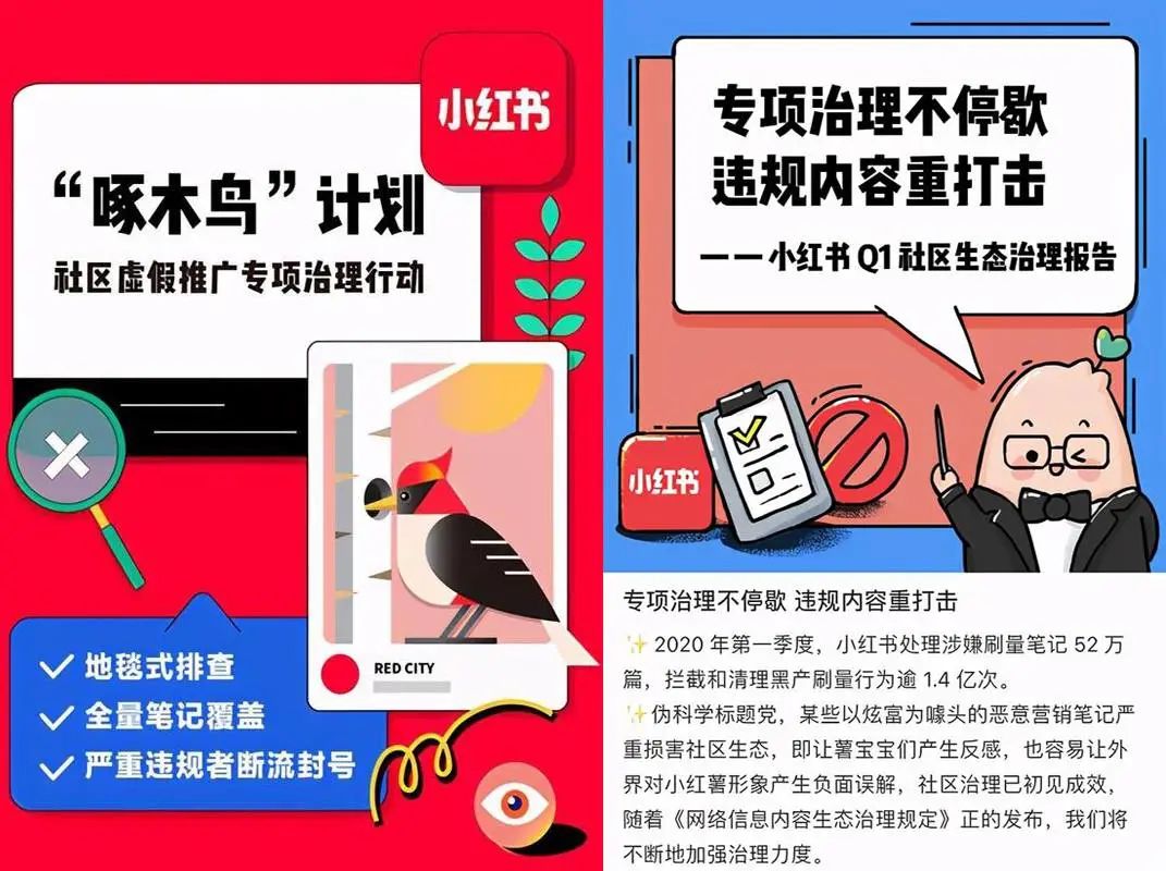 早在去年9月23日,小红书就正式启动“啄木鸟”计划,针对虚假推广行为进行专项严打,通过“多维度算法模型+人工审核”双重地毯式排查,覆盖全站所有笔记,严重违规行为将被断流封号处理。