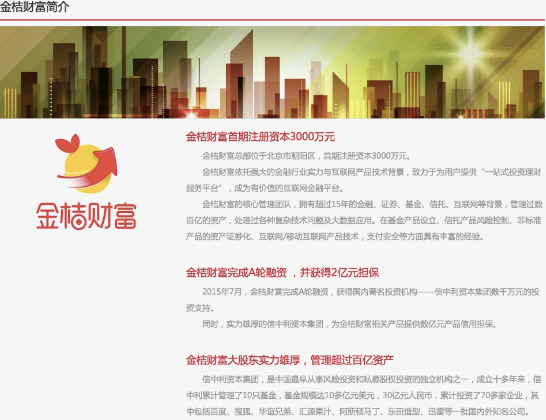 金桔财富主体为北京金桔树信息服务有限公司,是一家互联网金融公司,涉足供应链金融等,曾与海航合作“金桔财富—海航1号理财产品”,声称理财产品额度达到1亿元。金桔财富于2015年获信中利数千万元天使轮投资,信中利目前是其第二大股东,持股比例为14.9%。有图片信息显示,金桔财富曾介绍,信中利未金桔财富相关产品提供数亿元信用担保。目前,金桔财富官网无法已打开。