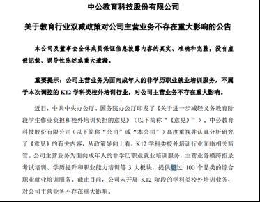 首先是中公教育曾发布公告表示,“公司未开展K12阶段的学科类校外培训业务,对公司主营业务不存在重大影响”