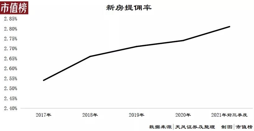 结果是,贝壳的新房提佣率从2017年的2.54%一路上扬,到了2021年前三个季度,综合的新房提佣率已经上升至2.81%。