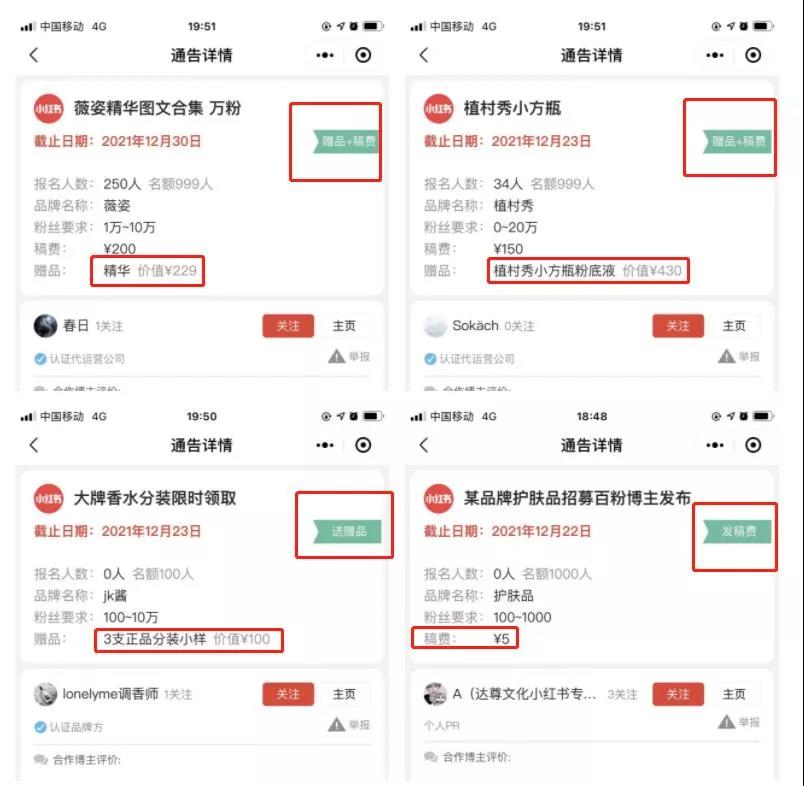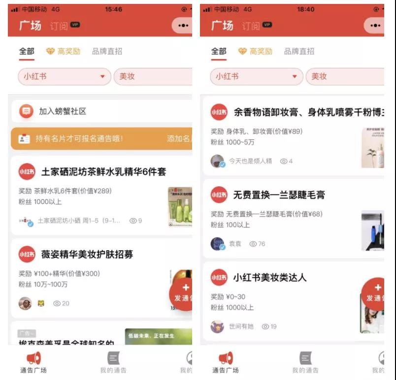 基于此,品牌通过外部中介机构或者平台,以产品置换或现金的方式寻找大量素人,在平台铺设涉嫌虚假营销的内容,一条虚假营销的黑灰产业链就此形成。据媒体报道,发需求单的品牌,以及如“螃蟹通告”、“红通告”、“微媒通告”等为代表的第三方接单中介平台,才是这条黑灰产业链上最关键的两环。青眼通过“螃蟹通告”小程序看到,目前上面有不少美妆品牌招募用户分享内容的信息。