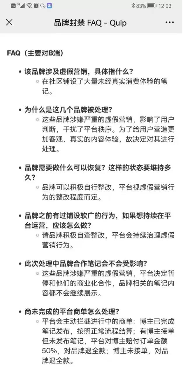 “主要是维护社区的内容生态。”一位小红书渠道投放公司负责人告诉青眼,“品牌涉嫌严重的虚假营销,在社区铺设了大量未经真实消费体验的笔记。影响了用户判断,干扰了平台秩序。为了给用户营造更加客观、真实的内容体验,故决定对其进行处理。”