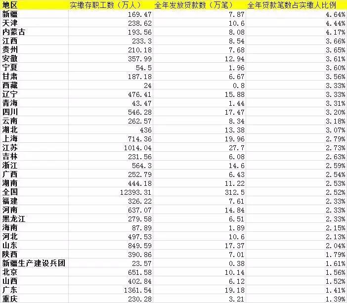 融360房贷(公众号fangdai123)发现,全年贷款笔数占实缴人比例,新疆最高,天津、内蒙古次之。比例高的地区多为西部欠发达地区。这说明,公积金制度在西部地区被用得更公平。原因也很好理解:西部地区房价低,买房较为容易,想买房的人用公积金贷款可以满足购房需求;而经济发达地区房价高,只依靠公积金贷款买房较难,还需要补充商业贷款,商贷对个人收入要求更高,不少想买房的人只能放弃贷款,望房兴叹。