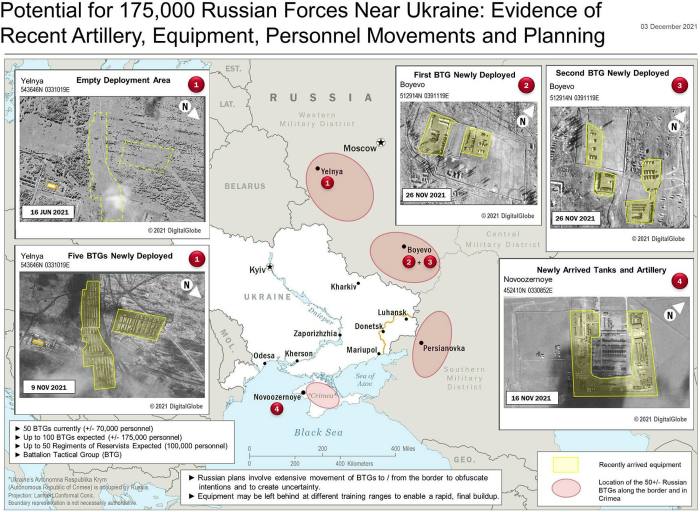 美国情报机构本月警告,俄罗斯可能最快于明年初入侵乌克兰,届时将动用约17.5万名士兵。乌克兰则称,现在俄罗斯已经向乌克兰边境地区派出了约10万士兵。