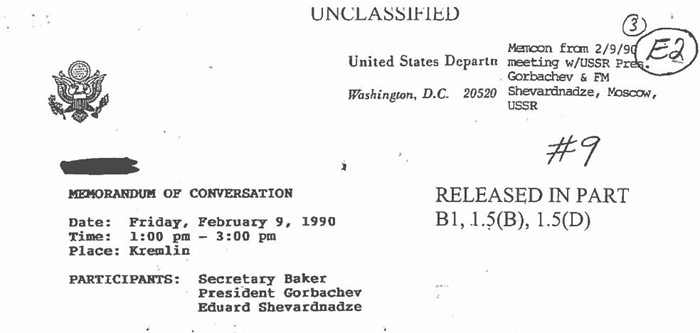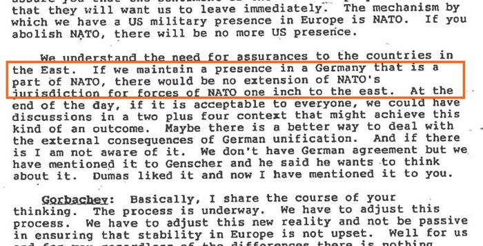 备忘录显示,1990年2月9日,戈尔巴乔夫与美国时任国务卿贝克举行会谈。当时贝克表示,如果德国统一后北约能在德国驻军,那么北约将不再向东部扩张“一英寸”。