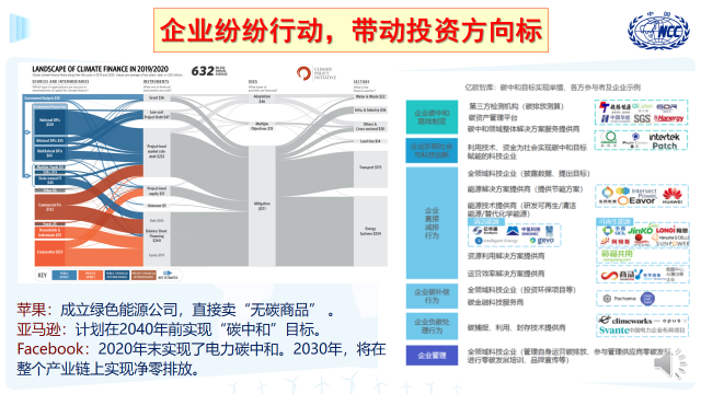 受气候紧迫性以及愈发具有雄心的政治动能的影响,最近十年,公共资金和私人资本投入气候领域的资金持续增长。2019年到2020年,全球气候资金总量为6320亿美元,比2017到2018年度增长了10%。从资金来源来看,气候资金中公共资金和私人资本的比例基本持平;从资金分布来看,用于气候减缓与适应的资金仍不平衡;从方式来看,债务(debt)仍然是气候资金的主流,股权(equity)的比例也在稳步提升。很多跨国公司都在积极布局,比如苹果成立了绿色能源公司。亚马逊在2019年上架了一大批贴有“气候友好承诺”标签的低碳商品。Facebook承诺到2030年将在整个产业链上实现净零排放。中国的很多企业也都行动起来了,通过直接减碳、数字赋能等各种方式做出努力。