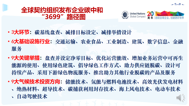金融投资机构要关注哪些领域,企业应该把握什么?全球契约组织最近发布了企业碳中和的“3699”路径图,明确了制定碳中和路线图时的3大环节、能源使用侧的排放最为密集的6大基础设施行业、各行各业可以广泛适用的9大关键举措、以及未来9大气候技术投资方向。这些都提供了很好的转型布局点。