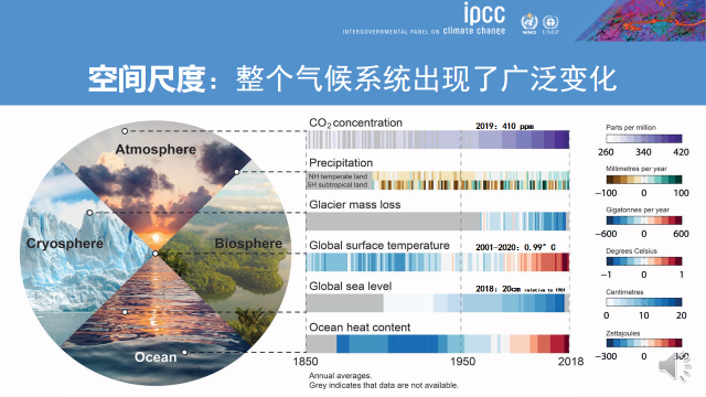 随着国际上知名的科学家组织-政府间气候变化专门委员会的陆续评估报告发布,人类活动对气候系统干扰的认识越来越受到政策制定者和公众的关注。目前气候系统的各个指标处于什么状态?这张图可以清晰看到大气温度、降水、CO2、冰川退缩、冰量损失、海平面上升、海洋热含量等,和工业化革命前相比都发生了非常显著的变化。也就是说气候系统出现了广泛的变化。