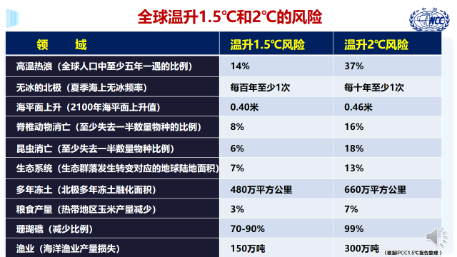 目前地球温度与工业革命比上升了约1.1℃。在未来全球温升达到1.5℃和2℃时,可以看到无论是在极端事件方面、还是冰冻圈系统、海洋和海洋生物、陆地生态系统、农业等诸多方面都有明显的负面风险。1.5℃和2℃虽然只是相差了0.5℃,但很多风险是呈指数增长的。这也就是为什么《巴黎协定》提出实现温度控制在2℃内,力争实现1.5℃目标的考虑。