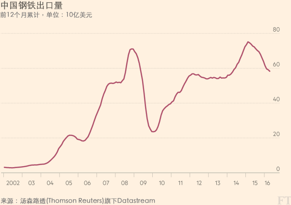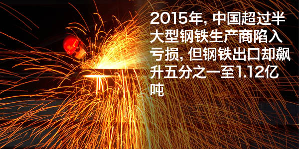 2015年,中国逾半大型钢铁生产商陷入亏损,其中多数为国家所有,这些公司非但没有关闭或者破产,反而继续大量生产超出国内需求的钢材。仅去年一年,中国钢铁出口飙升五分之一,至1.12亿吨——比世界第二大钢铁生产国日本的总产量还要多。