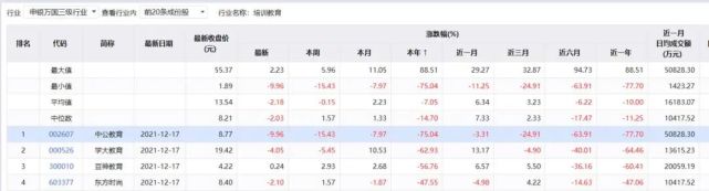截至12月17日,中公教育为2021年以来A股培训教育行业中跌幅最大的公司,年内跌幅达75.04%。当前市值较年内最高点蒸发近2111.10亿元。