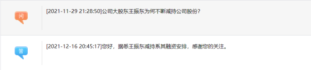 在互动问答中,曾有投资者询问“公司大股东王振东为何不断减持公司股份”。对此公司回复称,系融资安排。