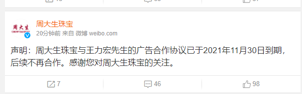 @周大生珠宝 微博12月18日声明,周大生珠宝与王力宏的广告合作协议已于2021年11月30日到期,后续不再合作。