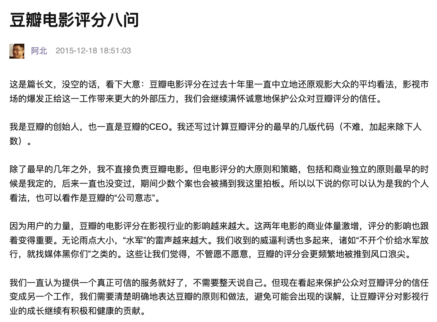 在过去的几年里,从制片到导演到演员,豆瓣因影视作品的评分而引来的炮轰和质疑一直很多,但官方鲜少正面回应。在2015年,豆瓣的创始人阿北曾经发过一篇长文《豆瓣电影评分八问》,针对人们关心的几大问题进行了详细解释。例如,豆瓣电影评分是谁定的?水军是怎么回事,豆瓣评分可刷吗?豆瓣电影评分和豆瓣电影商务是什么关系?
