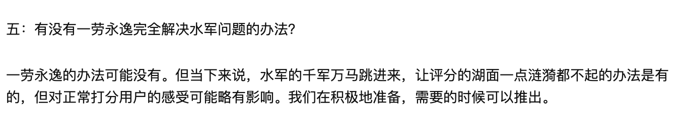 但这显然并没有平息利益相关方对于豆瓣评分的质疑。原因可能是人们根本不相信,也有可能是当年这篇“八问”传播不广。