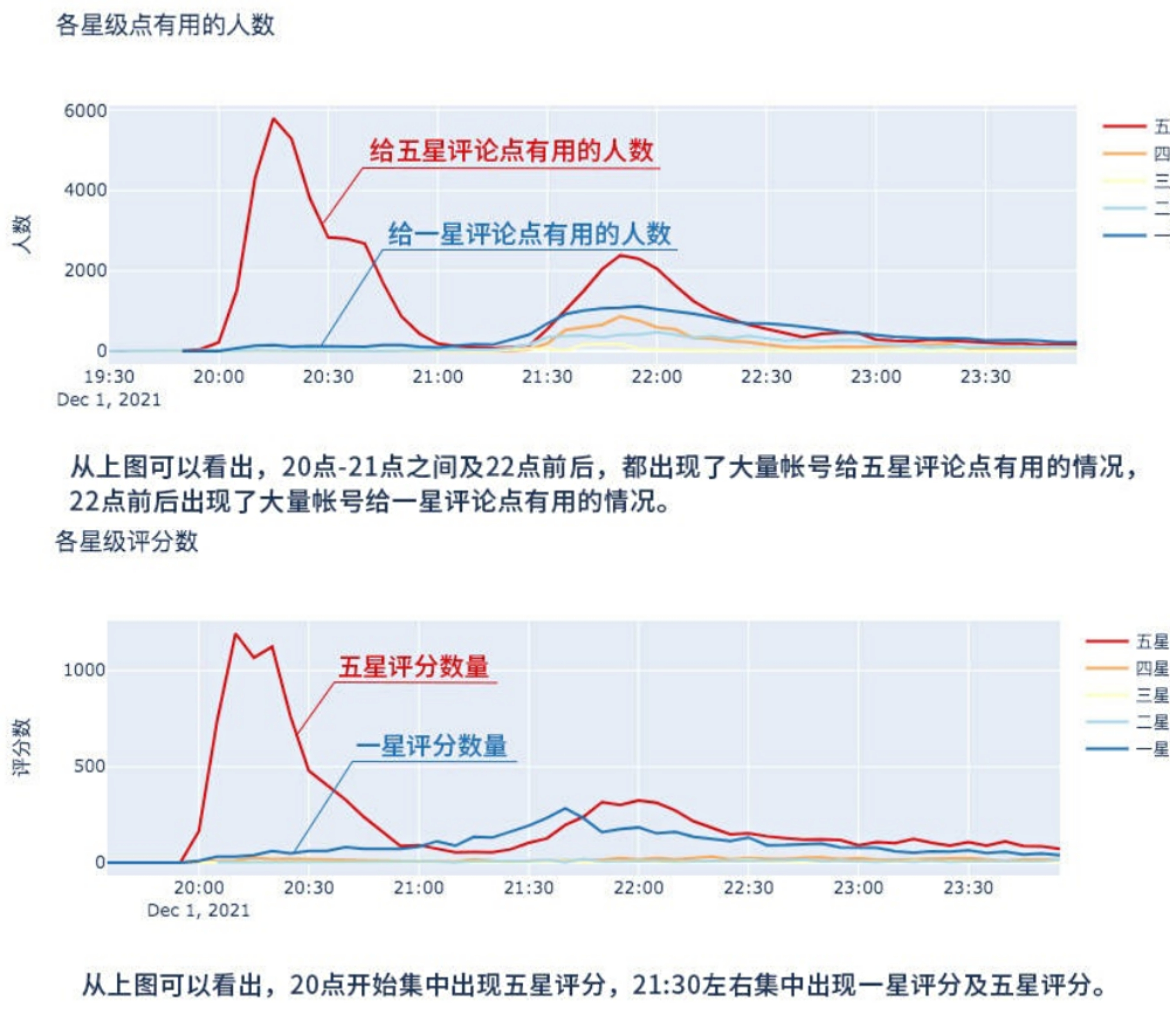 20点~21点,剧集未开播,条目下集中出现五星评分6752条,给五星评论点有用330,324次,涉及帐号14,747个;集中出现一星评分649条,给一星评论点有用3778次,涉及帐号1002个。这也意味着,开播前打五星的人数是一星的十倍,这似乎与之前粉丝的控诉并不相符。