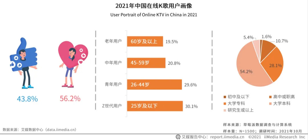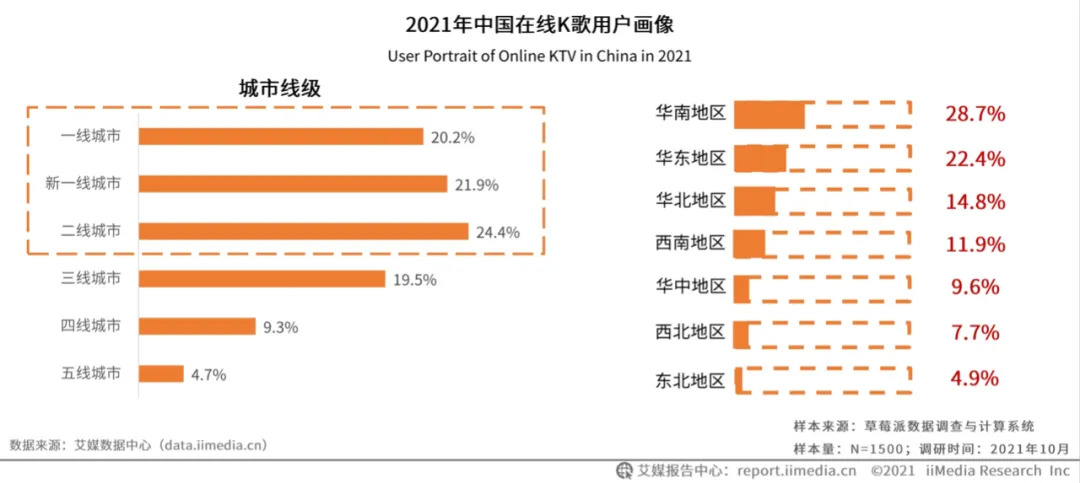 根据2017~2021年的走势判断,2022年的用户渗透率会进一步提升,与当下中国各种网络经济形态不断“下沉”所不同的是,K歌用户明显地呈现出全民化、高学历的趋势,且目前在新一线和二线城市的用户最多,其市场依然存在待激活和“下沉”的空间。