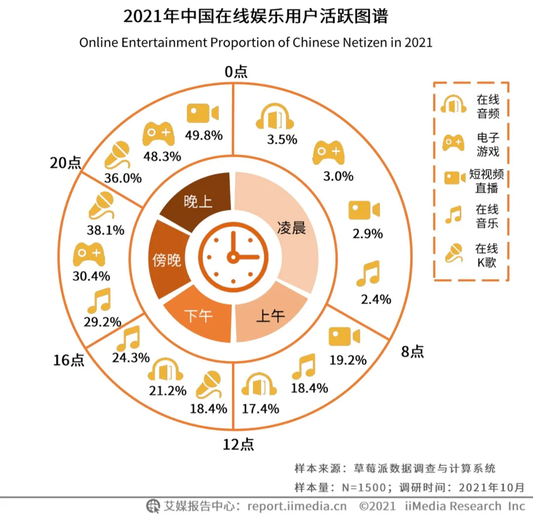 从用户画像和用户结构的总结,可体现出K歌“老少皆宜”的一面;从在线娱乐用户的活跃图谱中,不难看出在线K歌的“营业时间”集中在下午到晚上的时段,并且都占据较高的娱乐比重,已充分融入到人们日常的生活方式之中。
