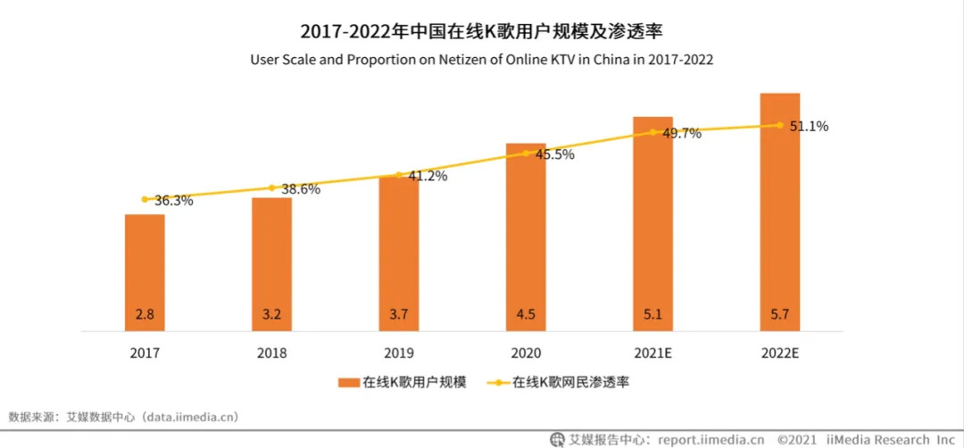 根据报告显示,2021年中国在线K歌用户规模达到5.1亿,并成为在线泛娱乐的主要项目之一。其中市场渗透率已达49.7%,几乎在每两个互联网用户之中,就有一个使用过在线K歌的产品。