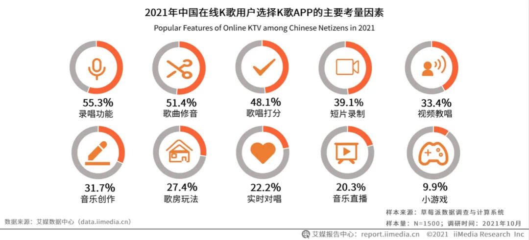 在线K歌是当今中国互联网用户的重要娱乐方式,其特点在于:与音视频项目相比,具有更强的沉浸式体验(可黏住用户);同时,“展现个人才艺”是K歌的核心体验功能,这与游戏产品的“成就”有相似之处。