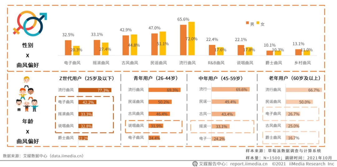 而在具体“唱什么”的问题上,相对高冷的爵士和乡村音乐,也占据一席之地;相对男性,喜爱摇滚和说唱的女性也并不算少;中年用户群体,对古风也很执着;而Z世代用户和银发族都很热衷电音。