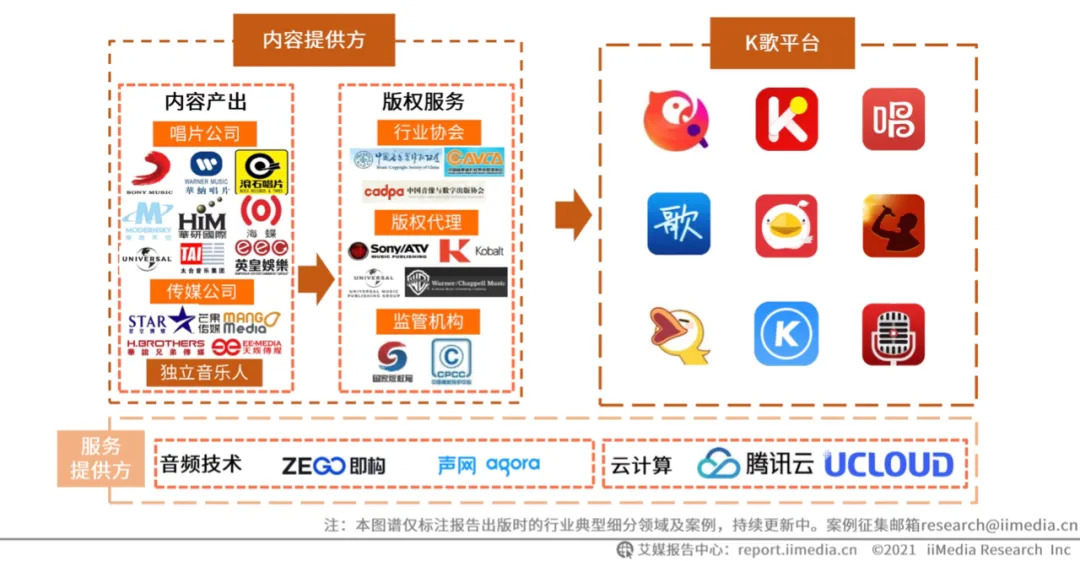 宏观角度,在线K歌的产业链也在日趋完善。从内容产出、版权服务等内容提供方,到众多的K歌平台,以及音频技术、云计算等底层与中后台服务,都已形成了完整的服务闭环。