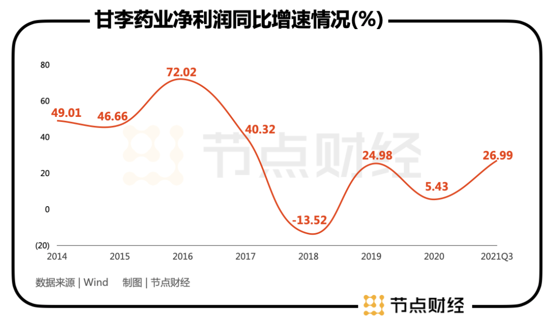 比如甘李药业,2020年净利率增速只有5.43%,而纵览其2014年以来的业绩,除却2018年,最少的年份也能增长个25%,其余几年均在40%-73%之间。