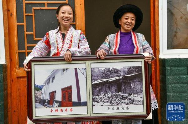 △2月20日,在贵州省毕节市黔西县新仁苗族乡大山深处的化屋村麻窝寨易地扶贫搬迁集中安置点,苗族女孩王代玉(左)与母亲杨文梅在自家新房前展示易地扶贫搬迁前后的对比照片。化屋村,过去叫“化屋基”,意为“悬崖下的村寨”。这里山势雄奇、水域宽广、风景如画,被誉为“乌江源百里画廊”。近年来,化屋村在实施易地扶贫搬迁的同时,大力发展特色种植、养殖、旅游等产业,村里迎来跨越式发展。