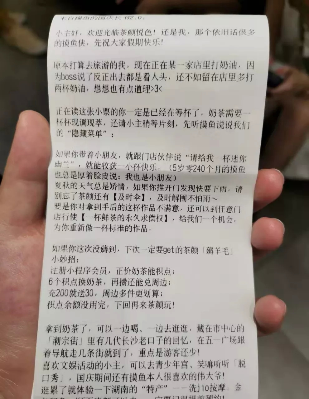 还有网友反映,“我住的小区门口就有茶颜,每天路过就能听到他们整齐划一的一直喊口号。没人的时候也要喊。我对茶颜观感很差,我没见过店员休息。小票越来越长,写不完的废话,能不能环保点?写那么长有人看?”