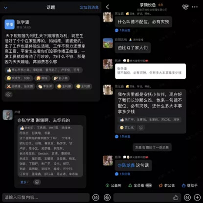 为什么一场发生在企业内部钉钉群中骂战能引发如此巨大声量的讨论?我们总结,有如下两个关键点:一个月一千多的工资、茶颜创始人亲自下场和员工对线、8000人深夜对线。