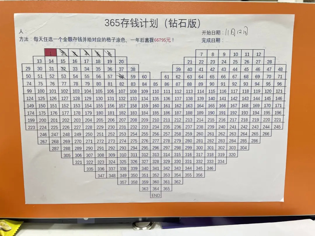 去年11月份,我和同事们立下Flag,要用365天趣味存钱法开启存钱计划,立志一年内存够66795元。