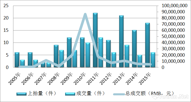 2005年—2015年唐英制瓷拍卖成交趋势图