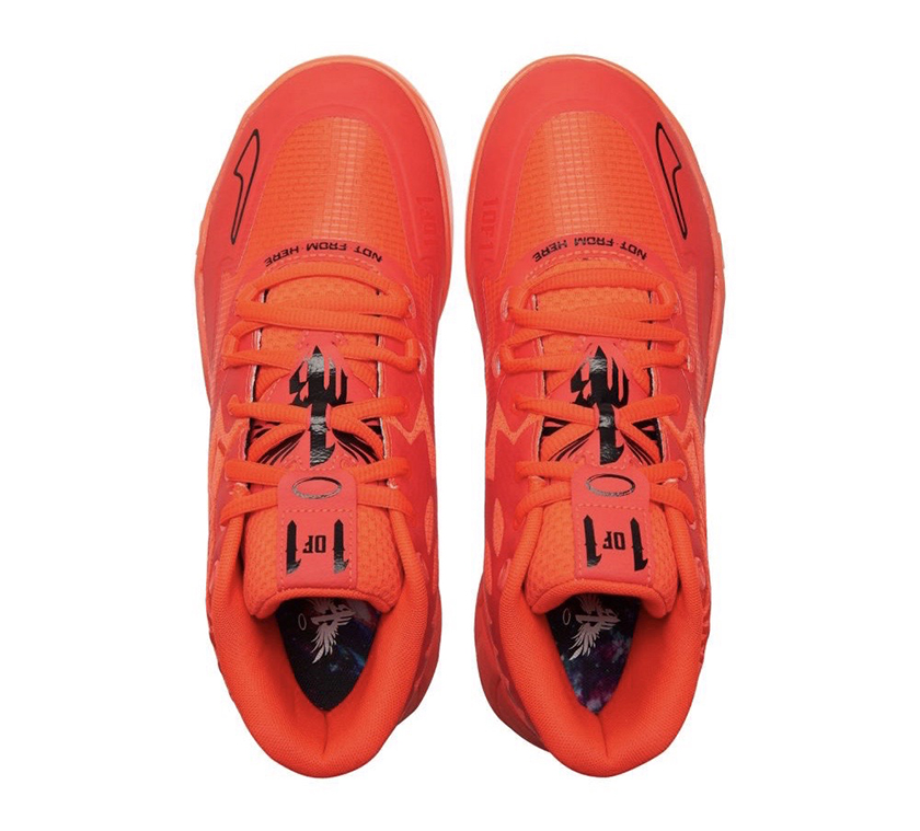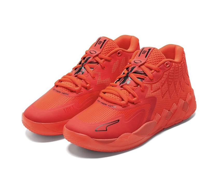 PUMA MB.01首发橘红配色,点缀少量黑色,鞋舌处印有“1 of 1”标志,以及标志性黄蜂三球logo。