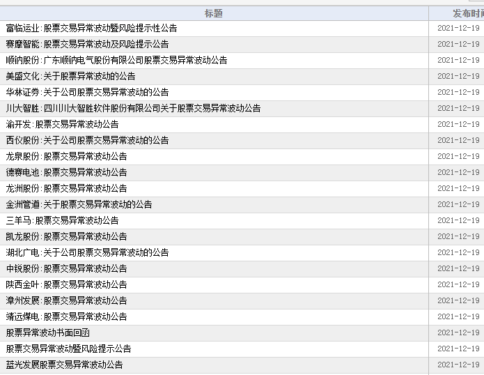 12月19日,富临运业(002357.SZ)、赛摩智能(300466.SZ)、顺钠股份(000533.SZ)、美盛文化(002699.SZ)等21家A股上市公司披露股票交易异动公告。