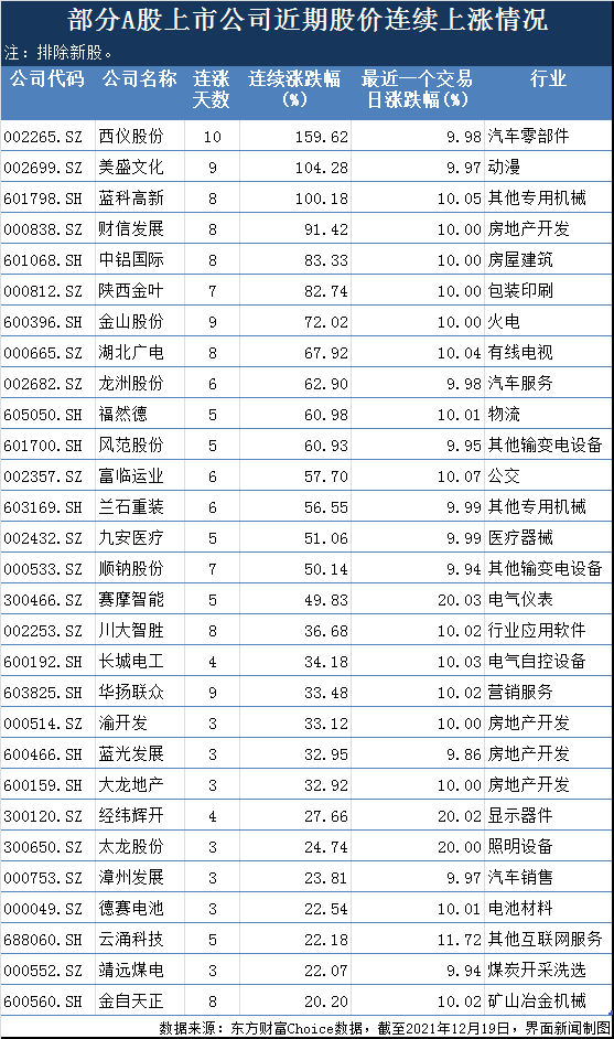 据东方财富Choice数据,三羊马、西仪股份、宣亚国际、美盛文化、蓝科高新(601798.SH)等5家公司近期股价连续涨幅超过100%,连续上涨不低于8个交易日。同时,财信发展(000838.SZ)、中铝国际(601068.SH)、陕西金叶、金山股份(600396.SH)等12家A股公司近期股价连续涨跌幅在50%至100%之间,连续上涨不低于5个交易日。